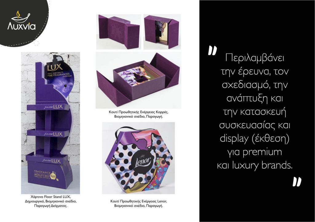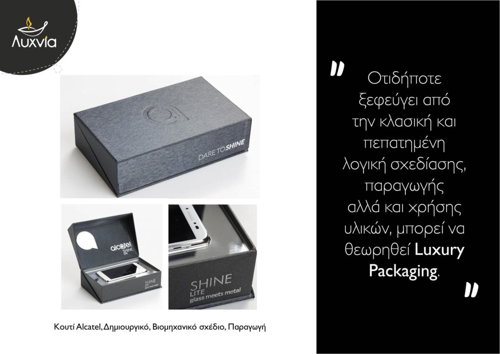 Οτιδήποτε ξεφεύγει από την κλασική και πεπατημένη λογική σχεδίασης, παραγωγής αλλά και χρήσης υλικών, μπορεί να θεωρηθεί Luxury Packaging. Όταν μιλάμε για Packaging στην ουσία μιλάμε για συσκευασία και έκθεση premium προϊόντων ή προϊόντων στα οποία θέλουμε να δώσουμε υψηλή αξία.